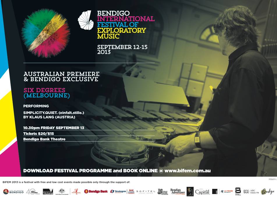 6˚ensemble is performing the Klaus Lang piece for Soprano, Percussion, Flute and Viola einfalt. stille. as part of the inaugural year of the Bendigo International Festival of Exploratory Music, curated by the Australian composer David Chisholm.